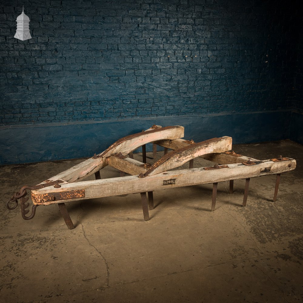 Weathered timber and rusted iron show long service in the field. The worn surfaces give a clear sense of age and honest use. This piece suits a rural display, farmyard setting, or anyone collecting early agricultural implements.