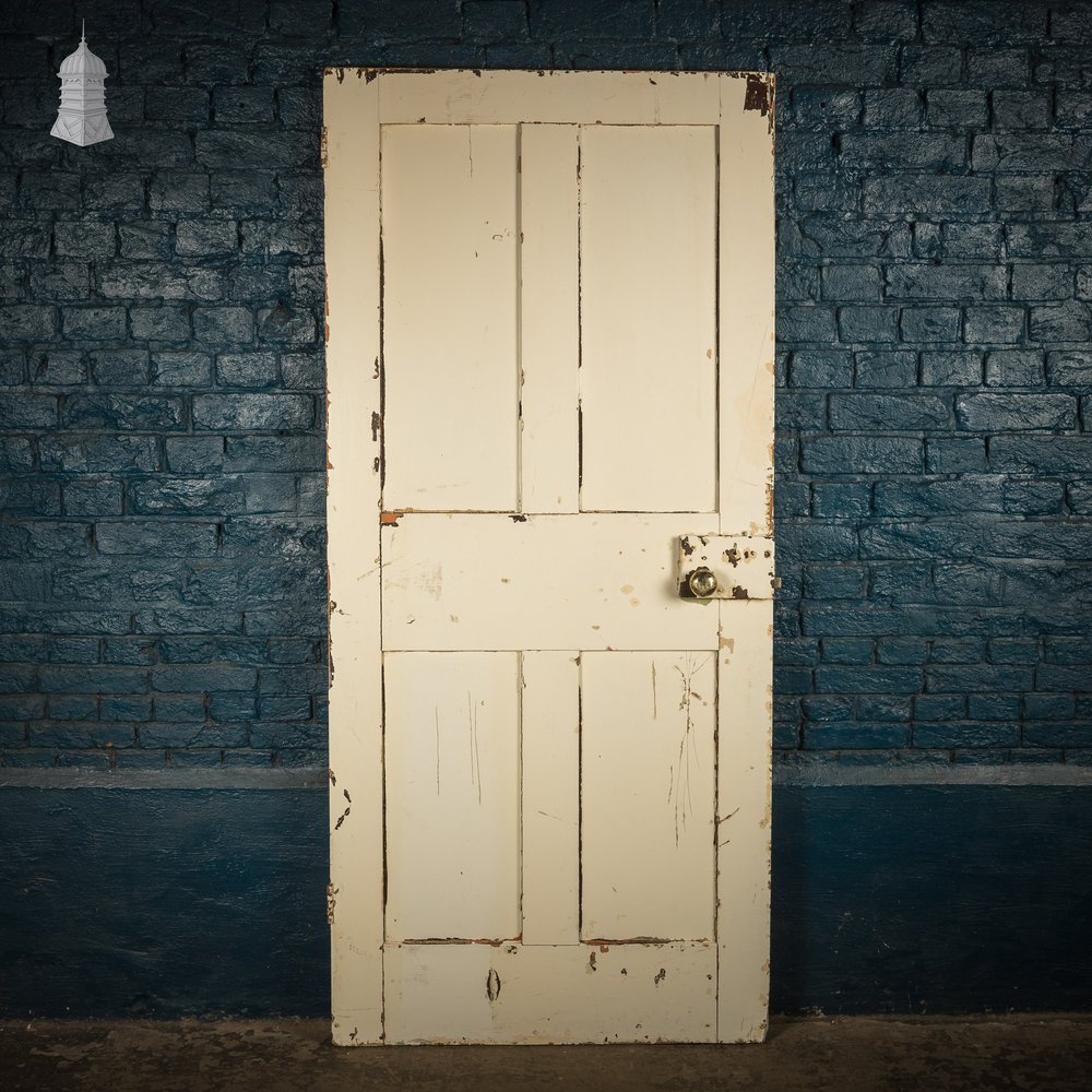 Reclaimed 4-panel door with two pairs of simple vertical panels. Hinges and locks intact. Distressed white gloss on one side and bright orange paint on the reverse. Knocks, scuffs, and general wear consistent with age.