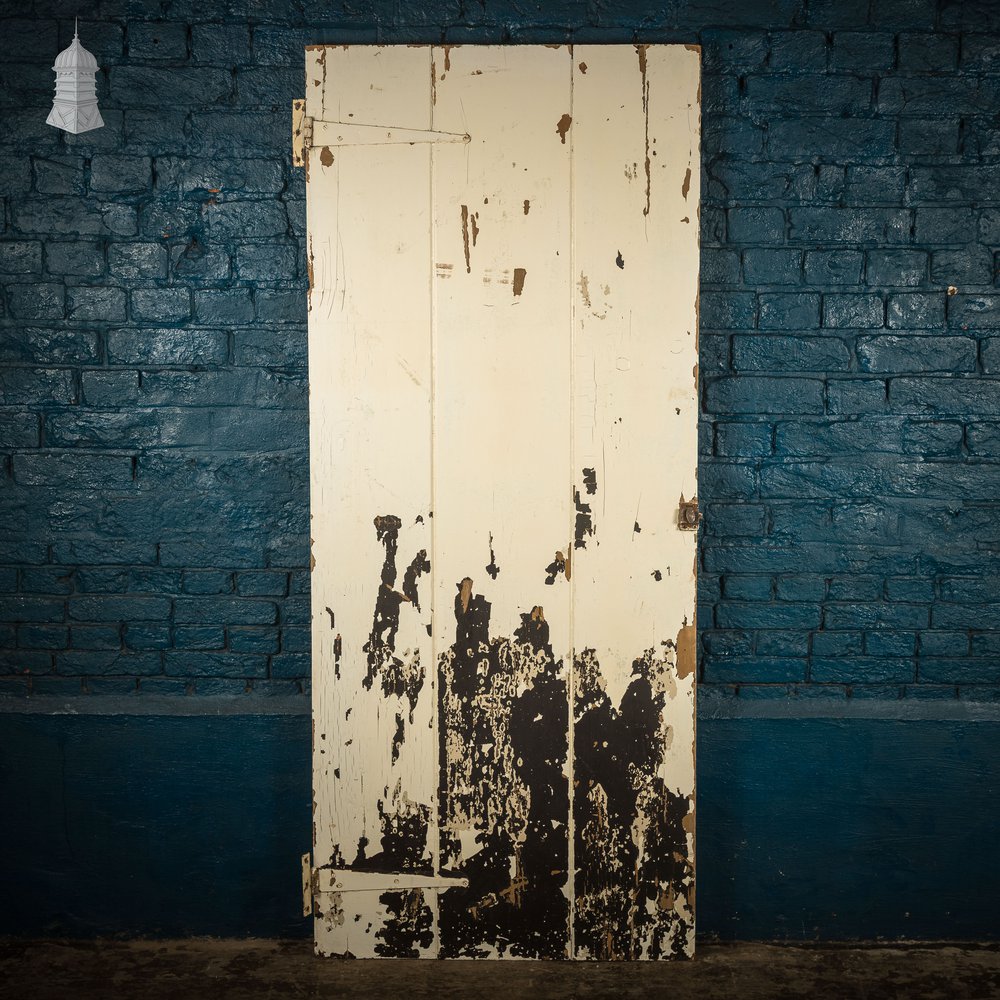 A reclaimed ledged 3 plank cottage door. Hinges and lock present, handles not included. Holes remain from removed hardware. Distressed black on one side and white on the reverse. Thickness is measured at the ledge. Knocks, scuffs and wear in keeping with the age of the product. Check listing images for condition.