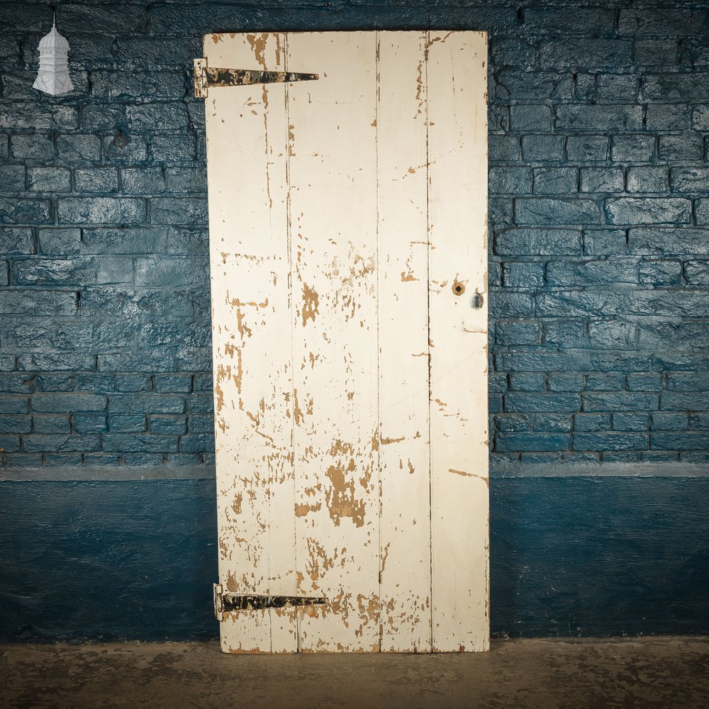 A ledged beadboard cottage door with original hinges and a distressed white paint finish. The thickness given in the measurements is taken at the ledge. Holes from previously removed locks and handles remain. Check images for condition.