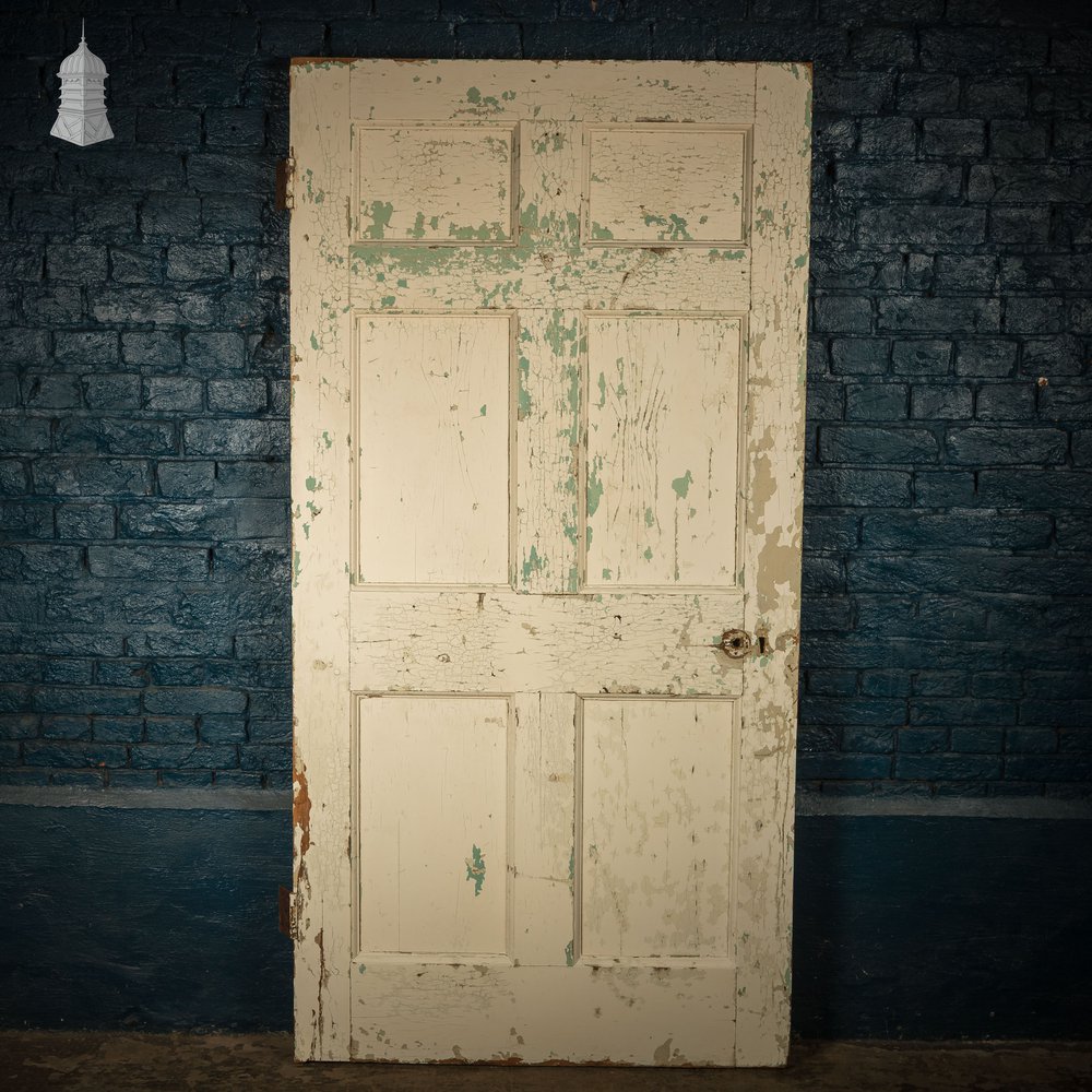 A reclaimed moulded 6 panel door with a traditional panelled layout. Hinges, lock and finger plates are present but handles not included. Holes remain from removed hardware. Distressed white and green paint on one side and cream on the reverse. Knocks, scuffs and wear in keeping with the age of the product. Check listing images for condition.