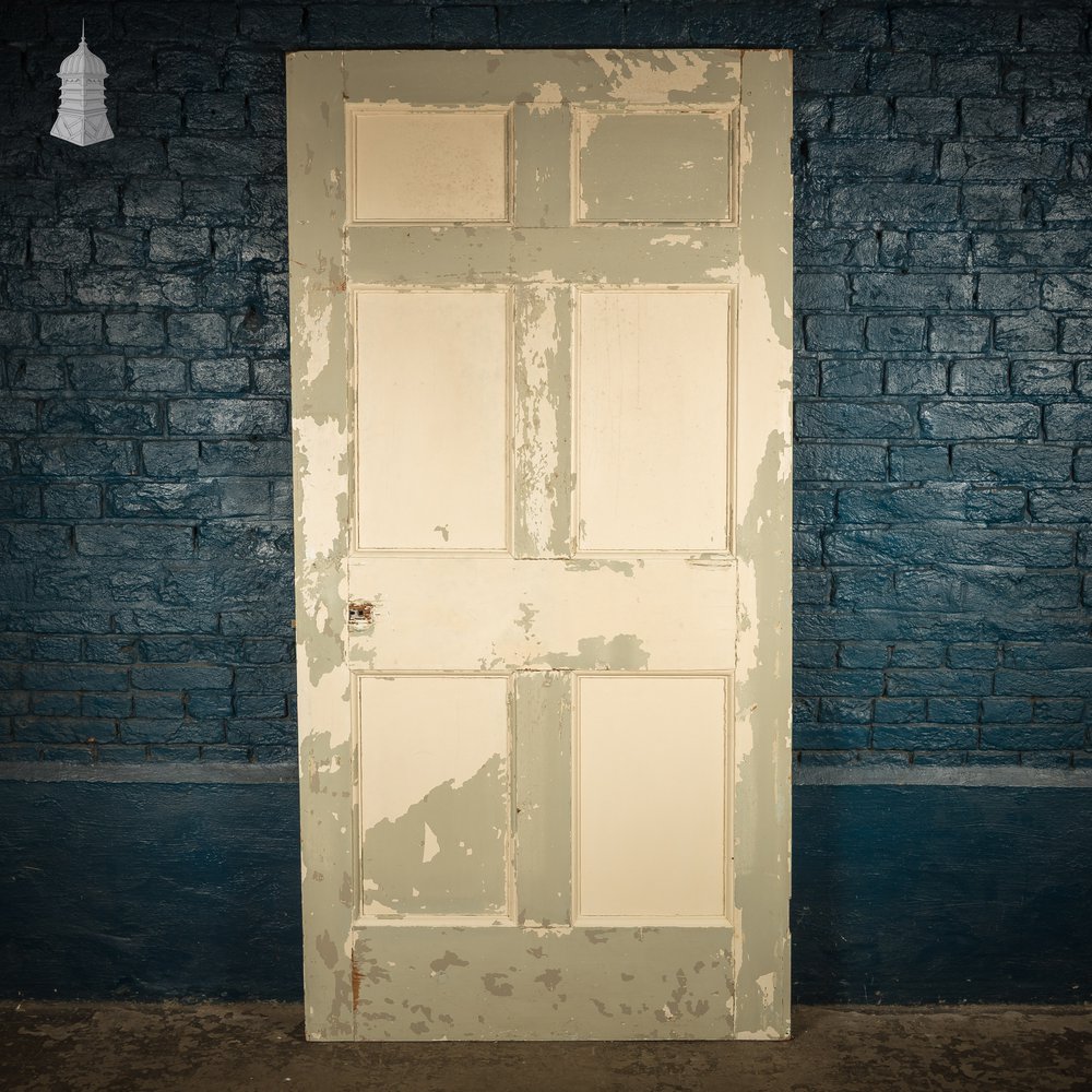 Reclaimed 6-panel door. Features two smaller upper panels above two pairs of lower vertical panels. Moulded panels with distressed white and green paint on one side, the reverse has a similar distressed paint finish, but the panels are not moulded. Hinges removed; multiple holes from previous handles. Knocks and scuffs consistent with age. Please refer to listing images for full condition.