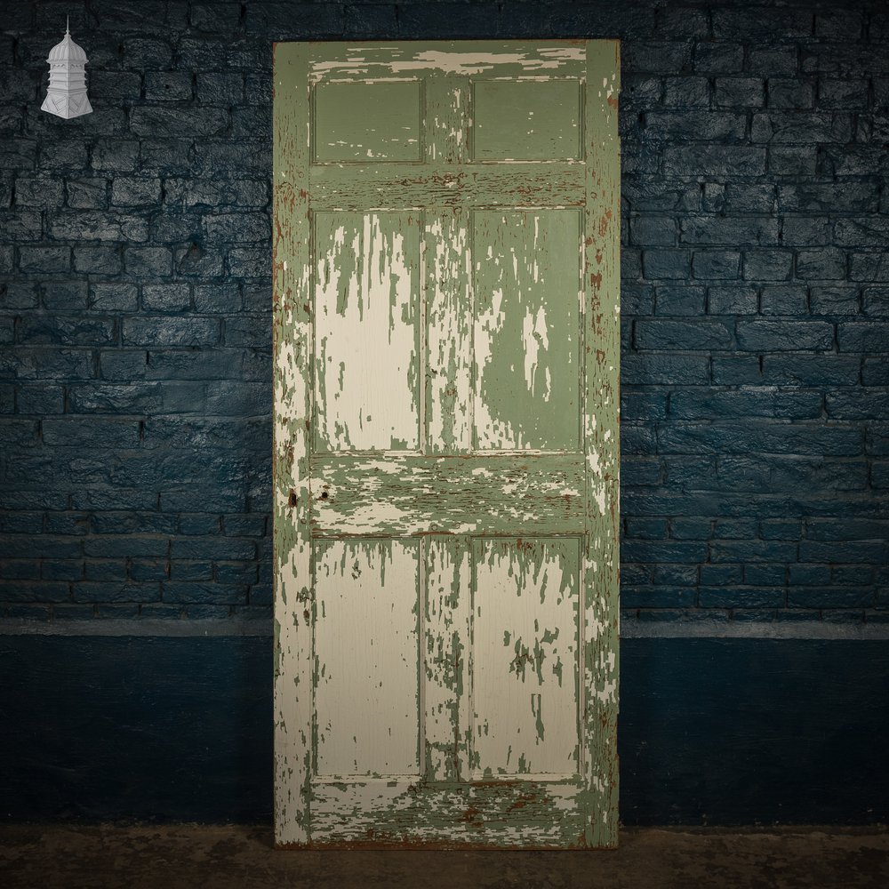 A moulded 6-panel door with green and white distressed paint on one side. The reverse is white and cream. The paint is flakey. No lock, hardware, or hinges remain, though the fixing holes are visible. The 6-panel layout has two small upper panels above two pairs of vertical panels below. The condition is typical for the age and previous use of the item. Please see the listing images to assess the condition for yourself.
