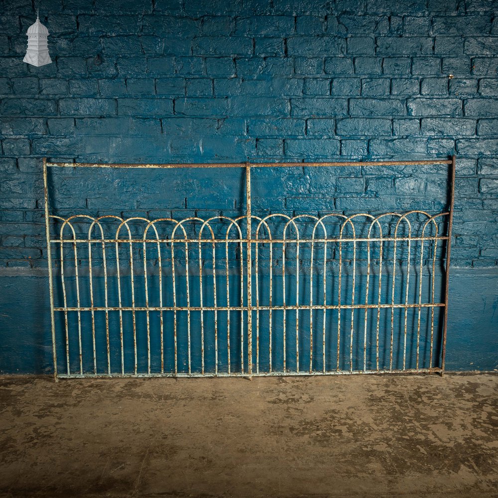 The railing features a simple, interlaced bow top or hoop top repeating arch design. This reclaimed railing shows signs of wear and tear consistent with its age.