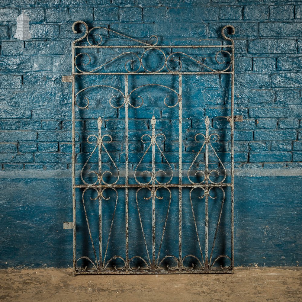 A late nineteenth to early twentieth century wrought iron gate with strong vertical form and detailed scrollwork. Three central vertical bars finish with spearhead finials. Symmetrical scrollwork surrounds them and forms heart or lyre shaped outlines within the middle panel. The top rail rises into an asymmetrical crest with large opposing scrolls and a central circular motif. One scroll appears to have been removed in the past, possibly to allow better access to the latch.