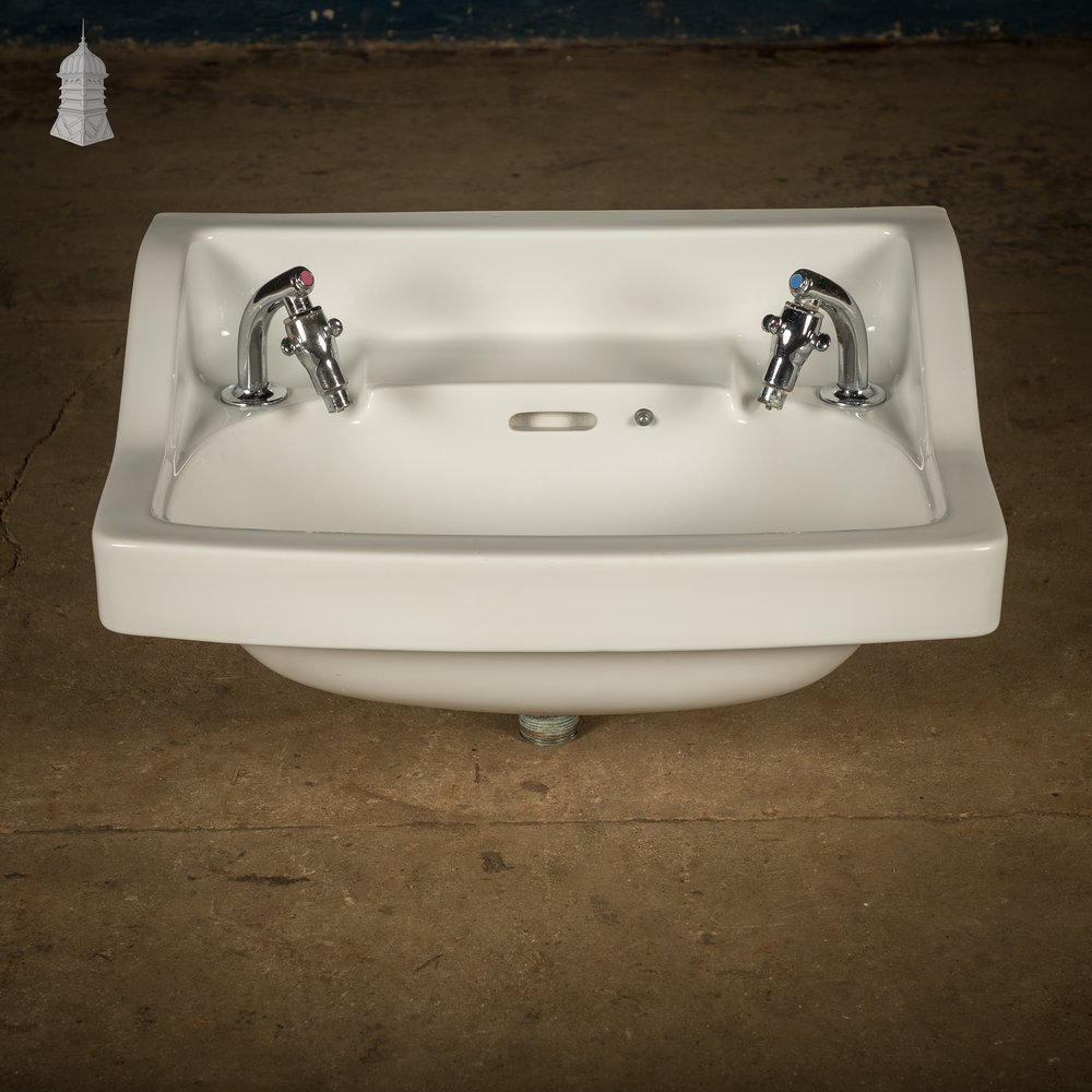 A traditional wall-mounted rectangular basin by Johnson Bros. (Hanley), Stoke on Trent. Fitted with classic Supataps, popular in the 1950s and 1960s, this model is designed for straightforward wall-hanging installation and offers a simple, functional style typical of the period. In good condition for its age, please see the listing images for more details.