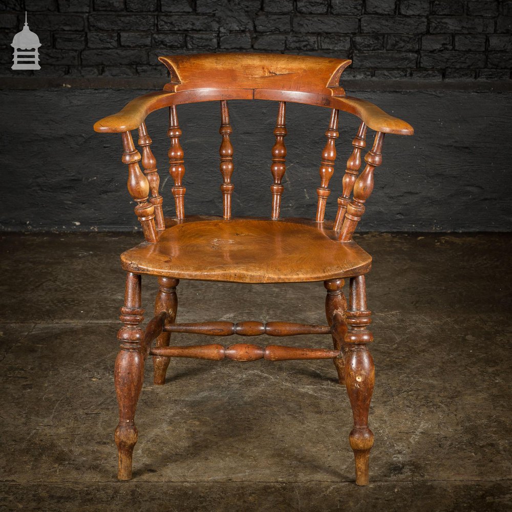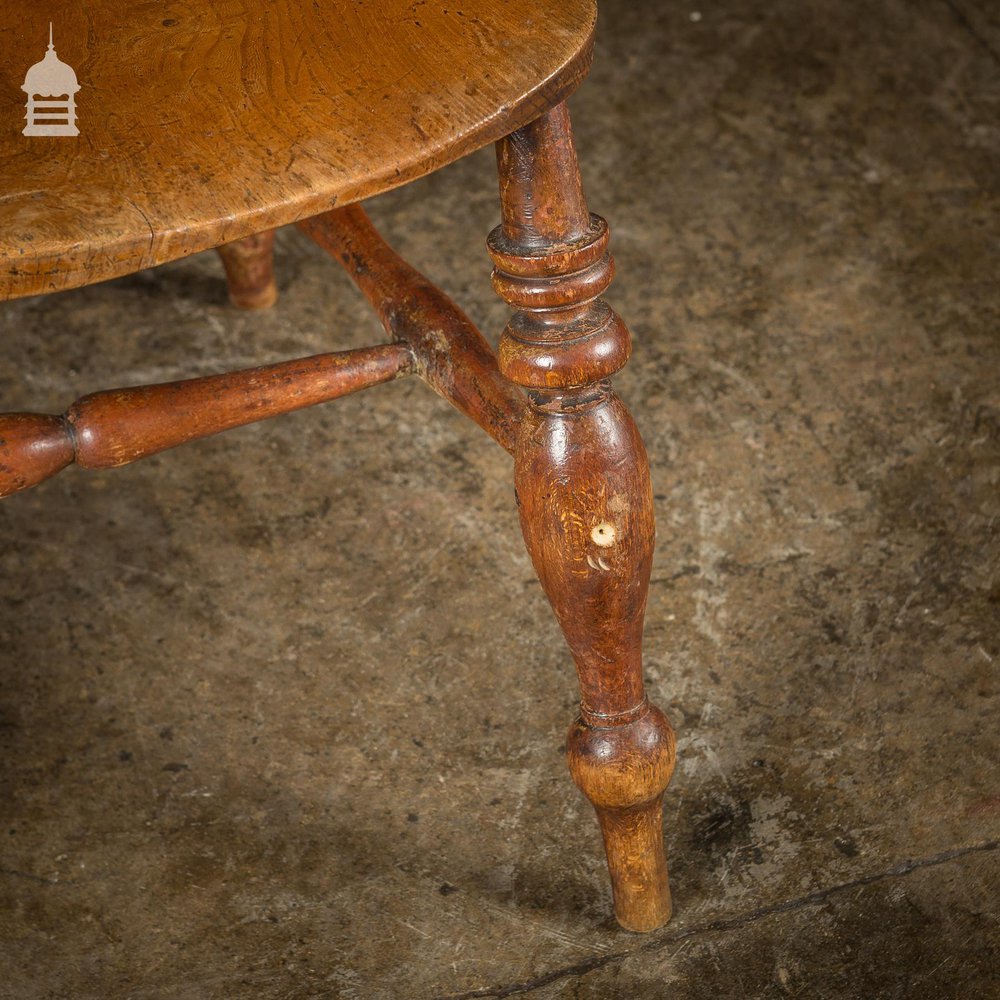 19th C Elm Captains Bow Seat Smokers Chair with Turned Arm Support and Double H Stretcher