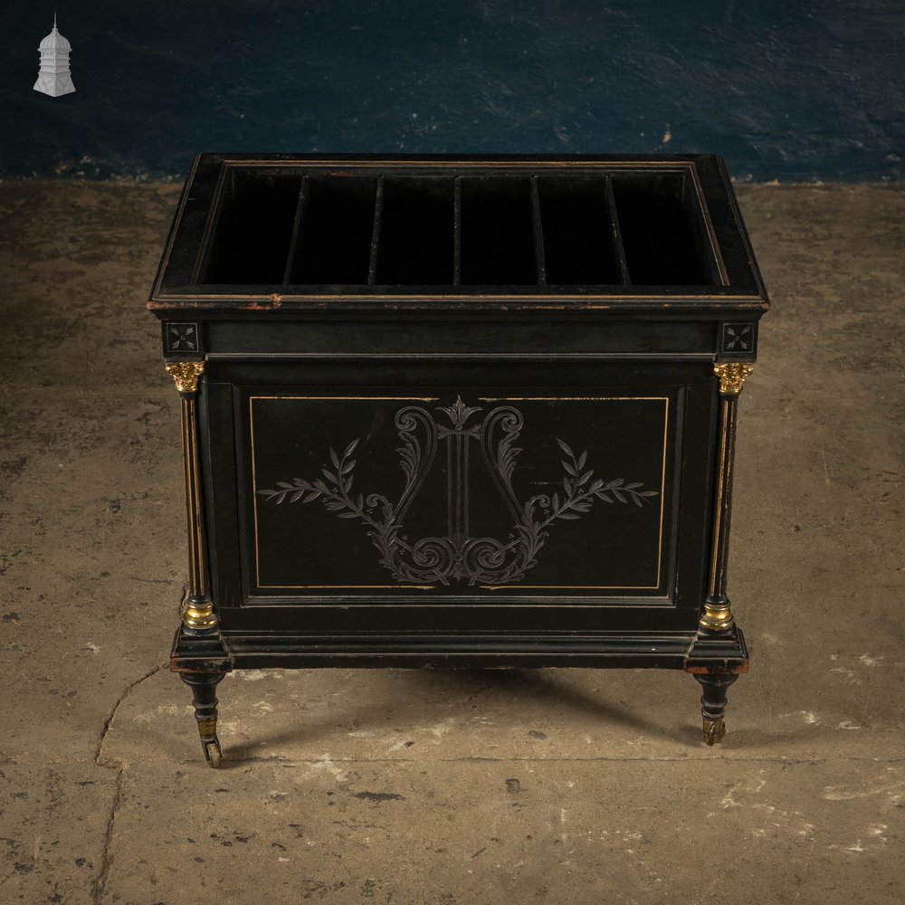 This Canterbury in constructed from ebonised hardwood and has short legs finished with a set of brass casters. There are five vertical slats creating six internal compartments. The exterior is decorated with a harp and foliage design on the two larger faces and a vase of wheat motif on the ends. The top rim and the four Corinthian columns on each corner are highlighted in gold.