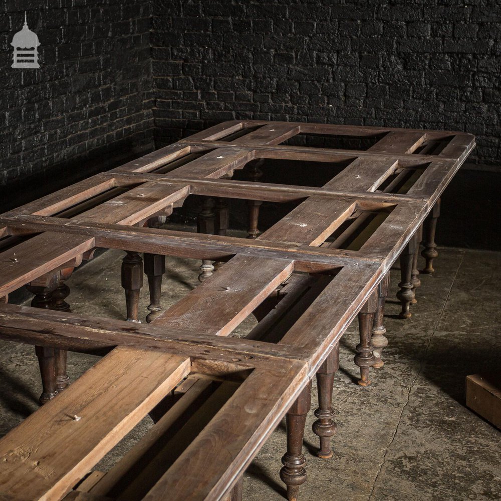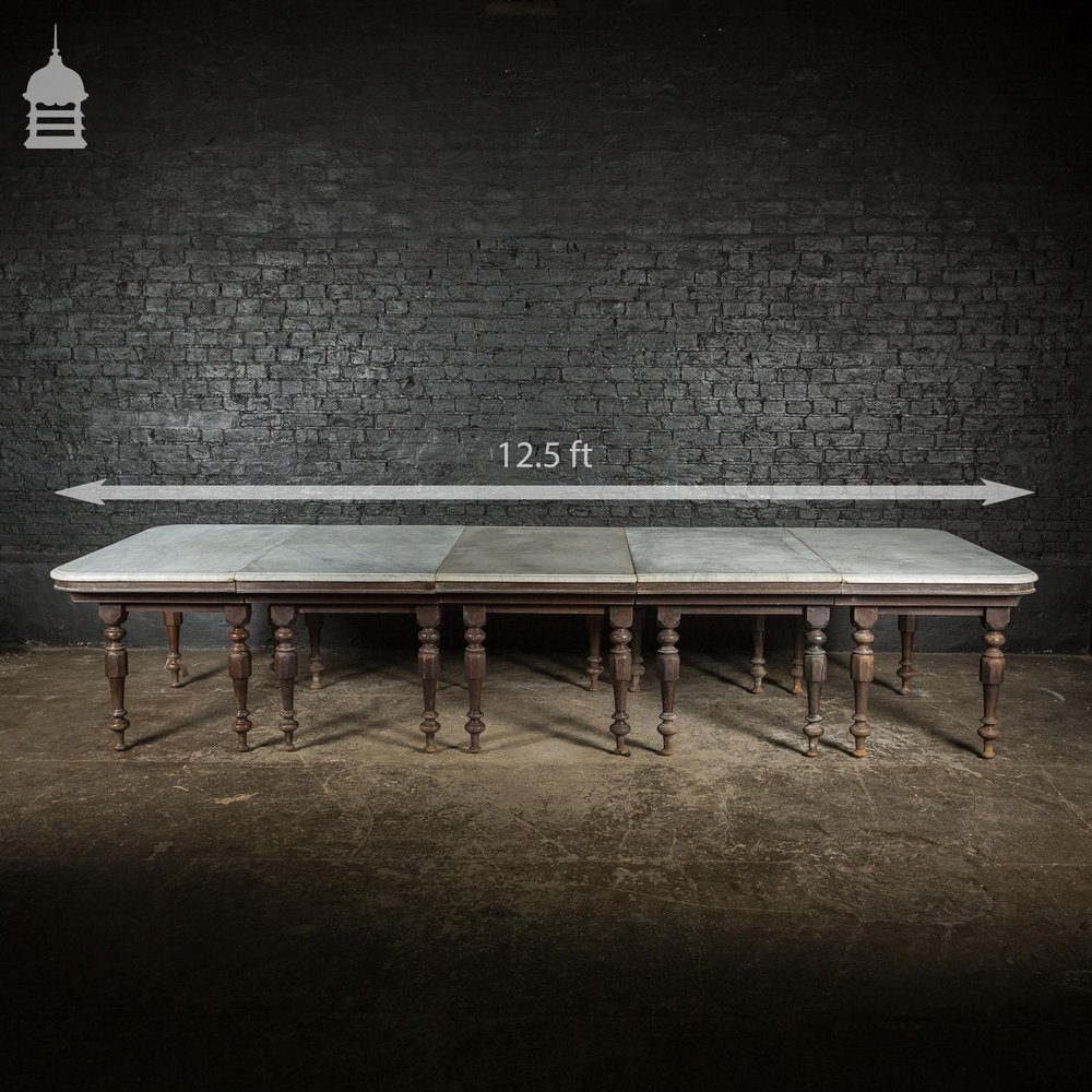 This impressive 7 Leaf Banqueting Table Extends from 5ft to 17.5ft in 2.5ft sections. The legs on the hardwood base sections fold flat so this huge table packs away into a relativity small space for storage or transportation. Please note that two of the marble tops have repairs as shown in the images.