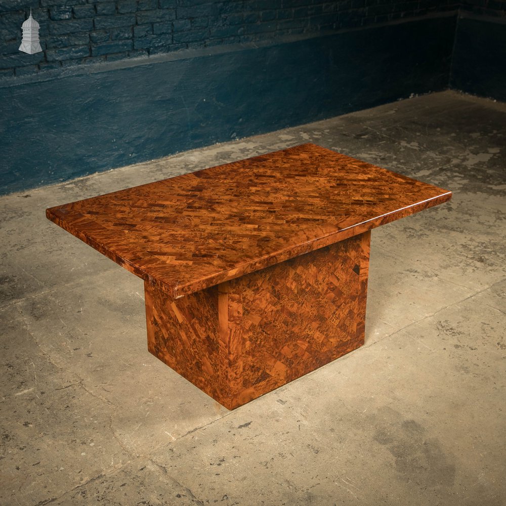 A Stunning 20th Century Burr Yew Marquetry Coffee Table in the style of Mario Sabot or Jean-Claude Mahey. The table top is removable. Please use the listing images as a visual reference to the condition of the item.