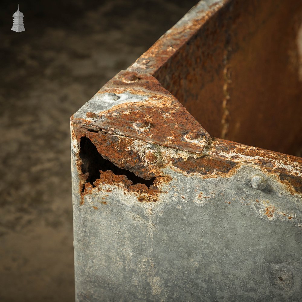 A large shallow reclaimed galvanised water trough tank with riveted edges and corners. Heavily rusted interior and a nicely weathered exterior. Some rusted holes to the base and corners so it will no longer hold water but it would make an impressive garden planter. Please use the listing photos as a visual reference of the condition.