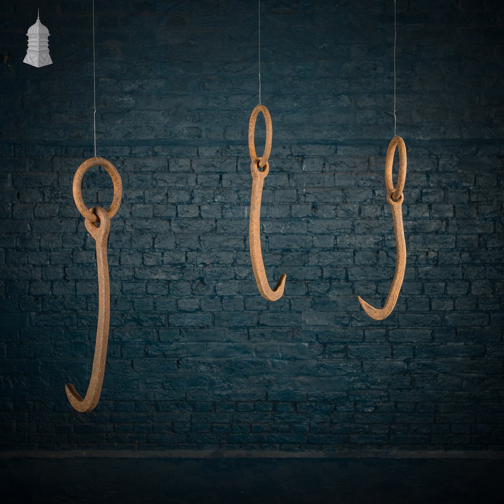 Graduated set of three wrought iron hooks, hand-forged and heavy-duty. Each features a large suspension ring and a robust curved hook, built to hold substantial weight.