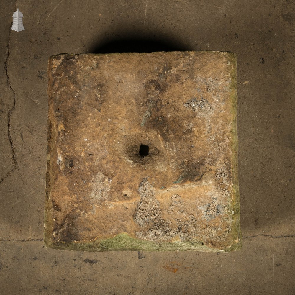 A square sandstone trough planter or drain cover. Shallow carved bowl and single drainage hole in the centre. Knocks and scuffs consistent with age. Please use the listing images as a visual reference of the condition.