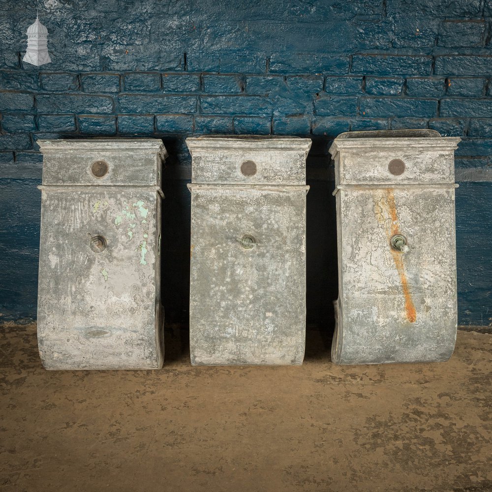 The zinc shows age and service wear. Surface marks and patina reflect years in place. The brass fist handles remain fitted and turn by hand.