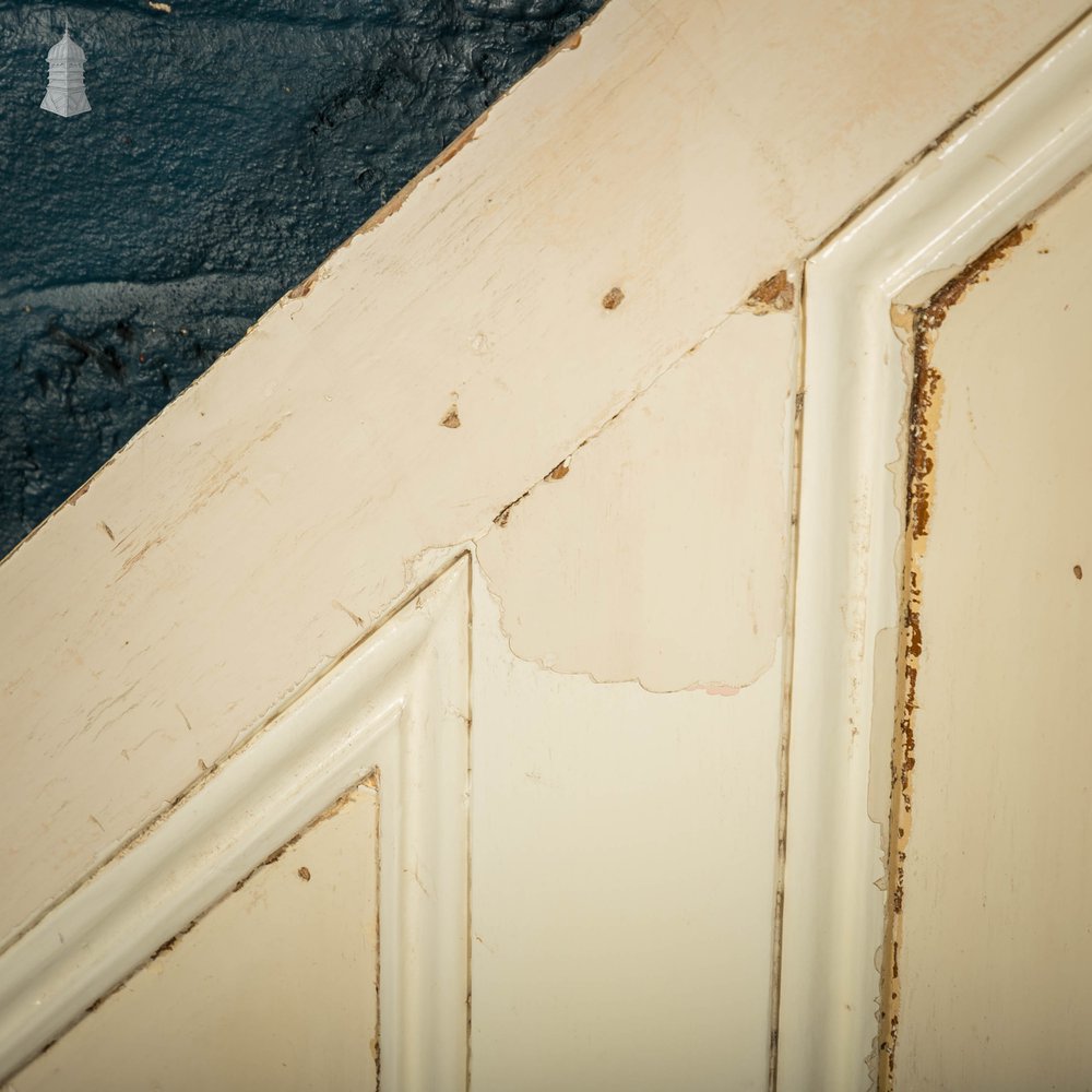 A reclaimed moulded staircase panel. White distressed paint finish. Triangular shaped panelling. Please use the listing photos as a visual reference of the condition.