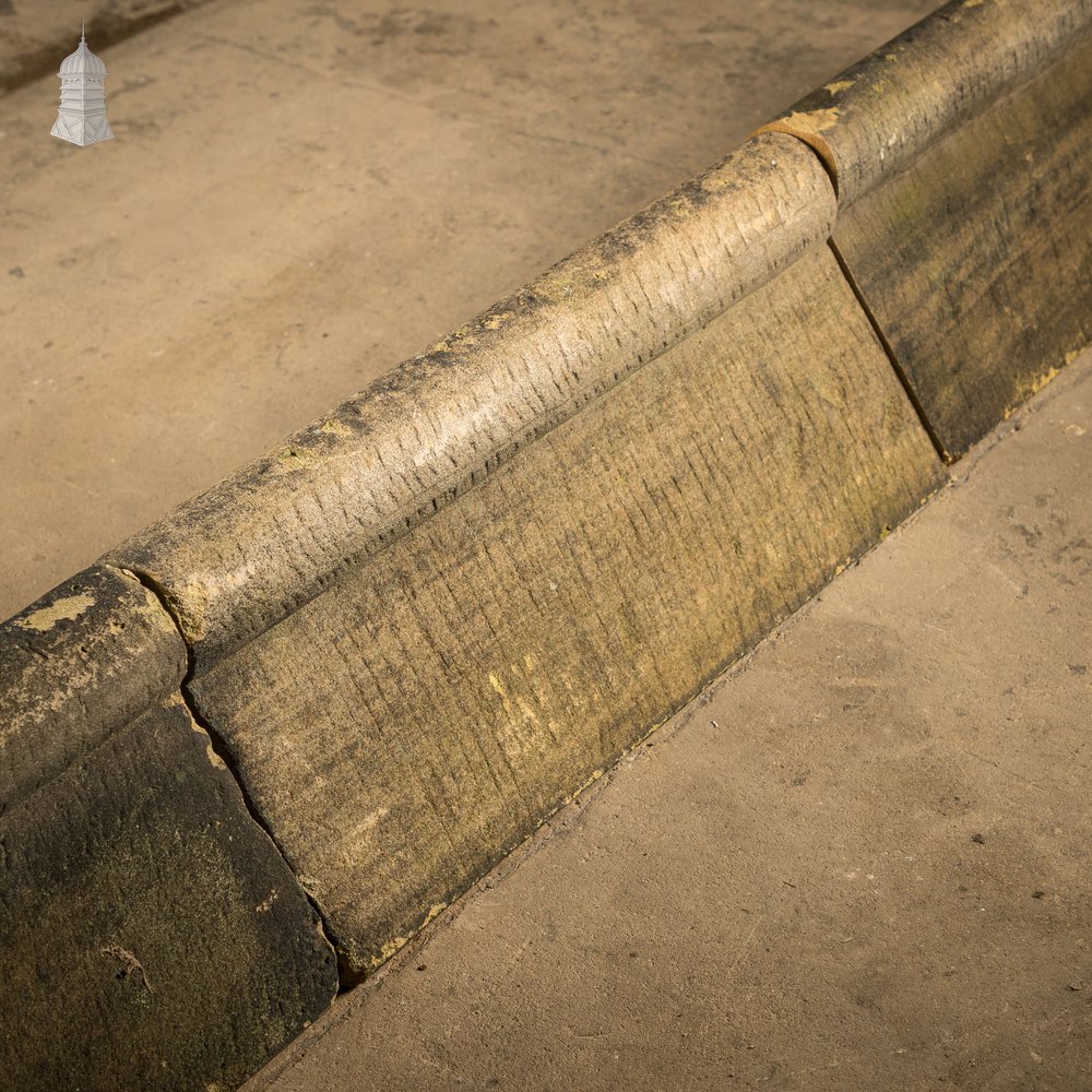 A batch of 19 linear metres of buff wave-scroll coping stones. Carved from sandstone, possibly York stone with a classic light tone. The run includes about 10 metres of longer sections and 9 metres of shorter sections. The copings were cut during reclamation to remove damaged areas, which is why the lengths vary. No drip channels on the underside. Reclaimed condition with small chips, marks, and traces of old mortar. See the listing images for a clear view of the batch.