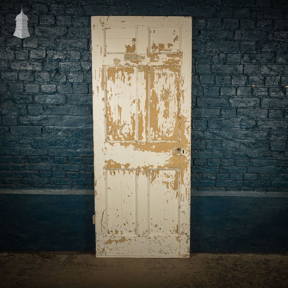 A reclaimed moulded 6 panel door with a classic balanced layout. Hinges present, but handles and locks removed. Holes remain from removed hardware. Distressed white and cream paintwork. Knocks, scuffs and wear in keeping with the age of the product. Check listing images for condition.