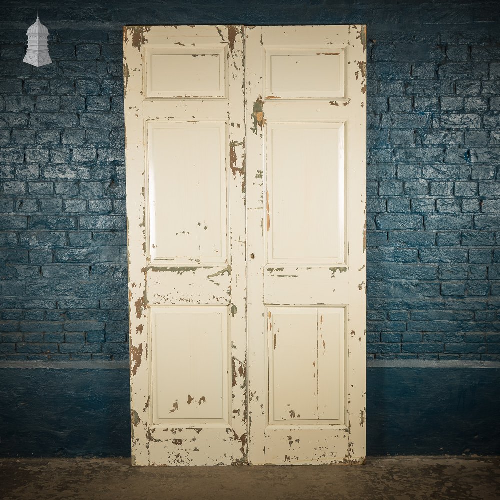 A pair of tall three-panel cupboard doors with an upper horizontal panel set above two vertical lower panels. The paint shows age and wear from long use. See images for condition.