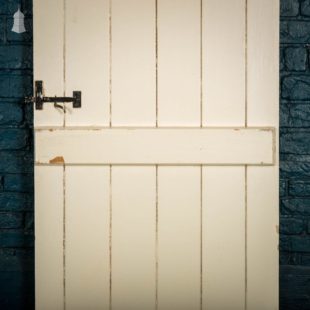 A reclaimed plank door with ledged supports. Holes from old hinges are present along with multiple holes from old locks and latches. Distressed paint finish. The thickness given is at the ledge. Wear including knocks and scuffs is consistent with age. Please use the listing photos as a visual reference of condition.