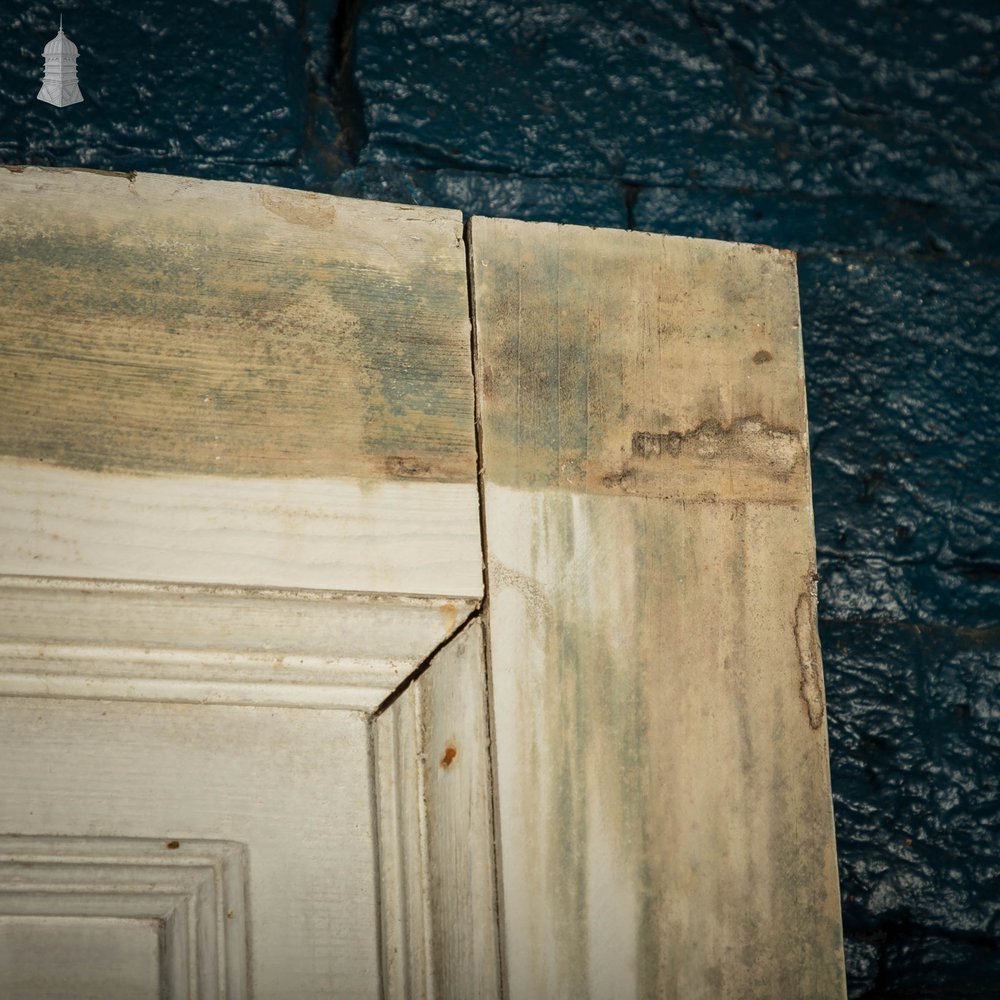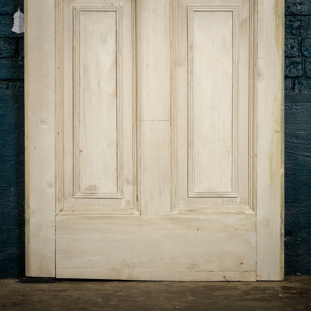 A reclaimed white painted pine panelled door. Two over two over two vertical moulded panels. Old hinges are present along with multiple holes from old handles and locks. Wear including knocks and scuffs is consistent with age. Please use the listing photos as a visual reference of the condition.