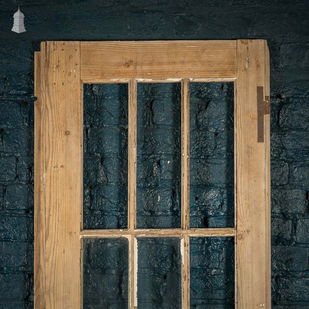 Reclaimed half-glazed door. Eight glazed panels over one lower moulded panel. Please note most glass is missing any that is remaining is damaged. Original hinges are present along with multiple holes from old handles and locks. Wear including knocks and scuffs is consistent with age. Use the listing photos as a visual reference of the condition.