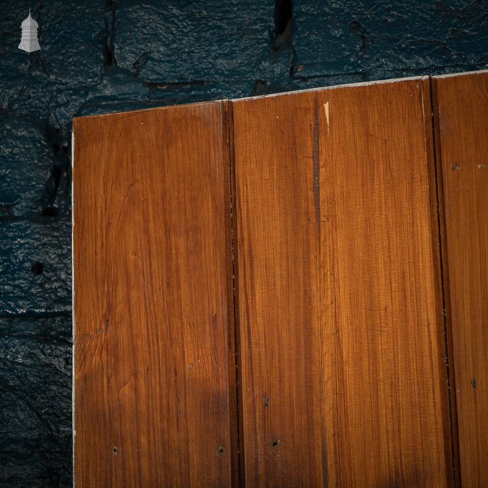 A reclaimed plank door with ledged supports. Holes from old hinges are present along with a lock and Suffolk latch. Distressed paint finish. The thickness given is at the ledge. Wear including knocks and scuffs is consistent with age. The door has an angled cut across the top. Please use the listing photos as a visual reference of condition.