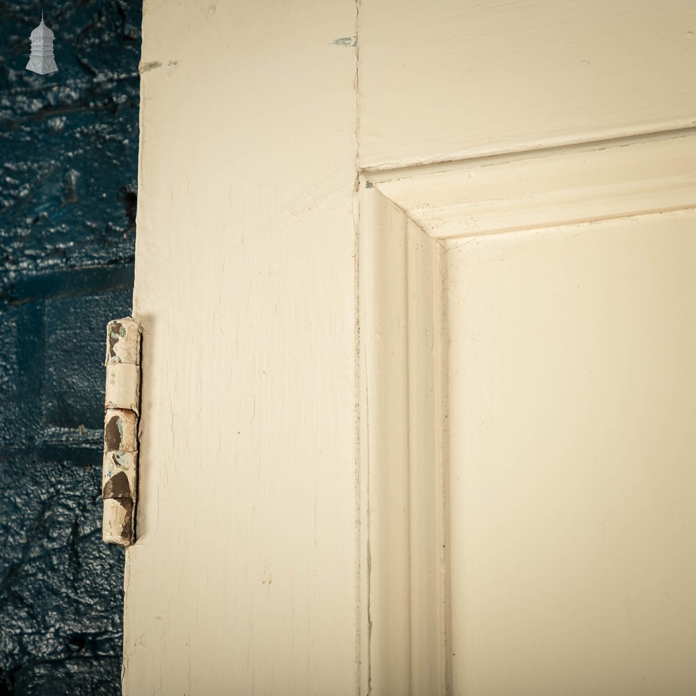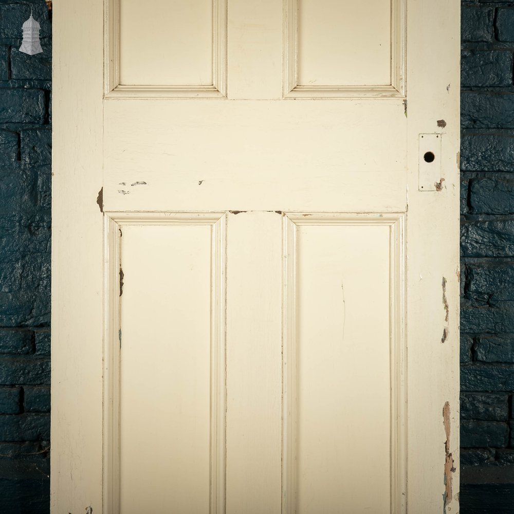 Four moulded panel pine door with white and green distressed paint finish, in original condition.