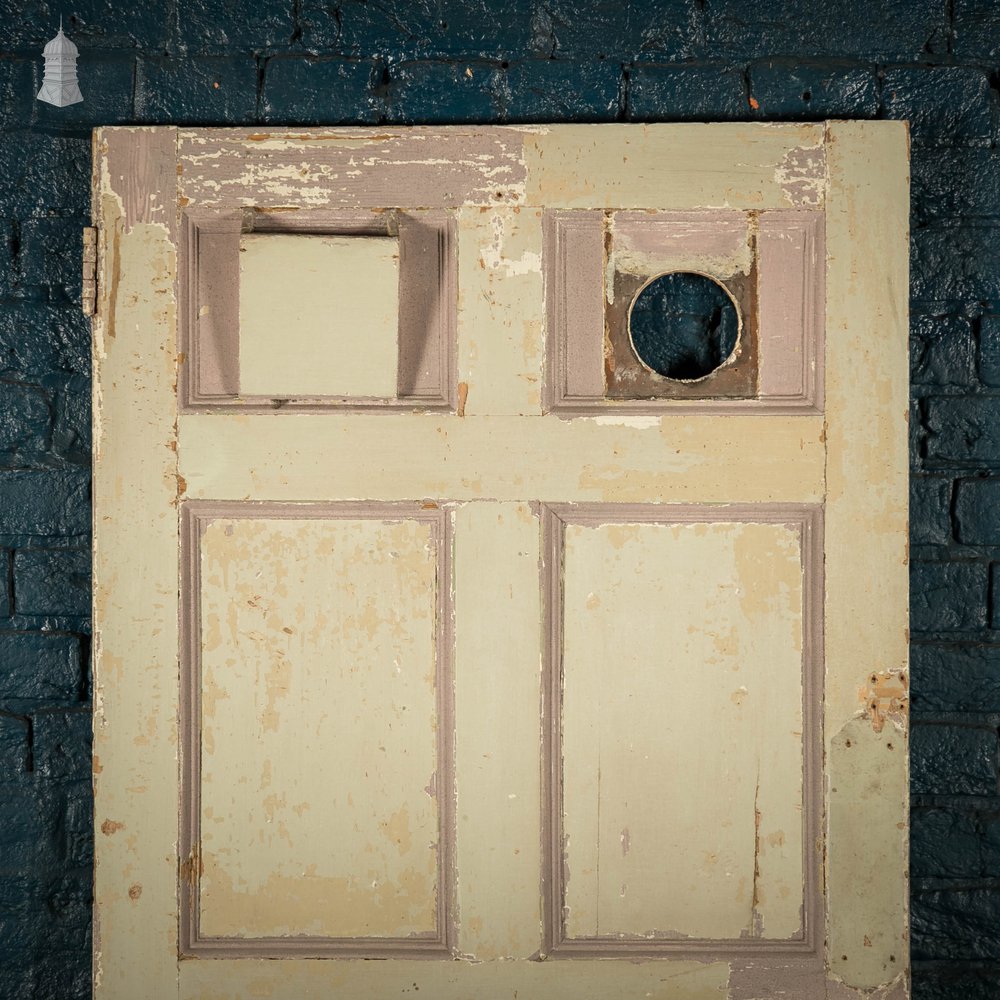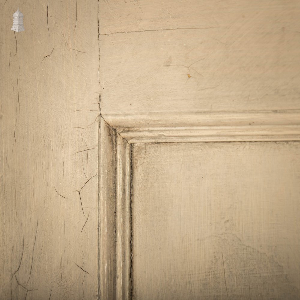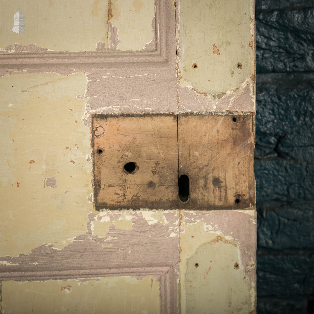 Six panelled moulded pine door with distressed paint finish in original condition.