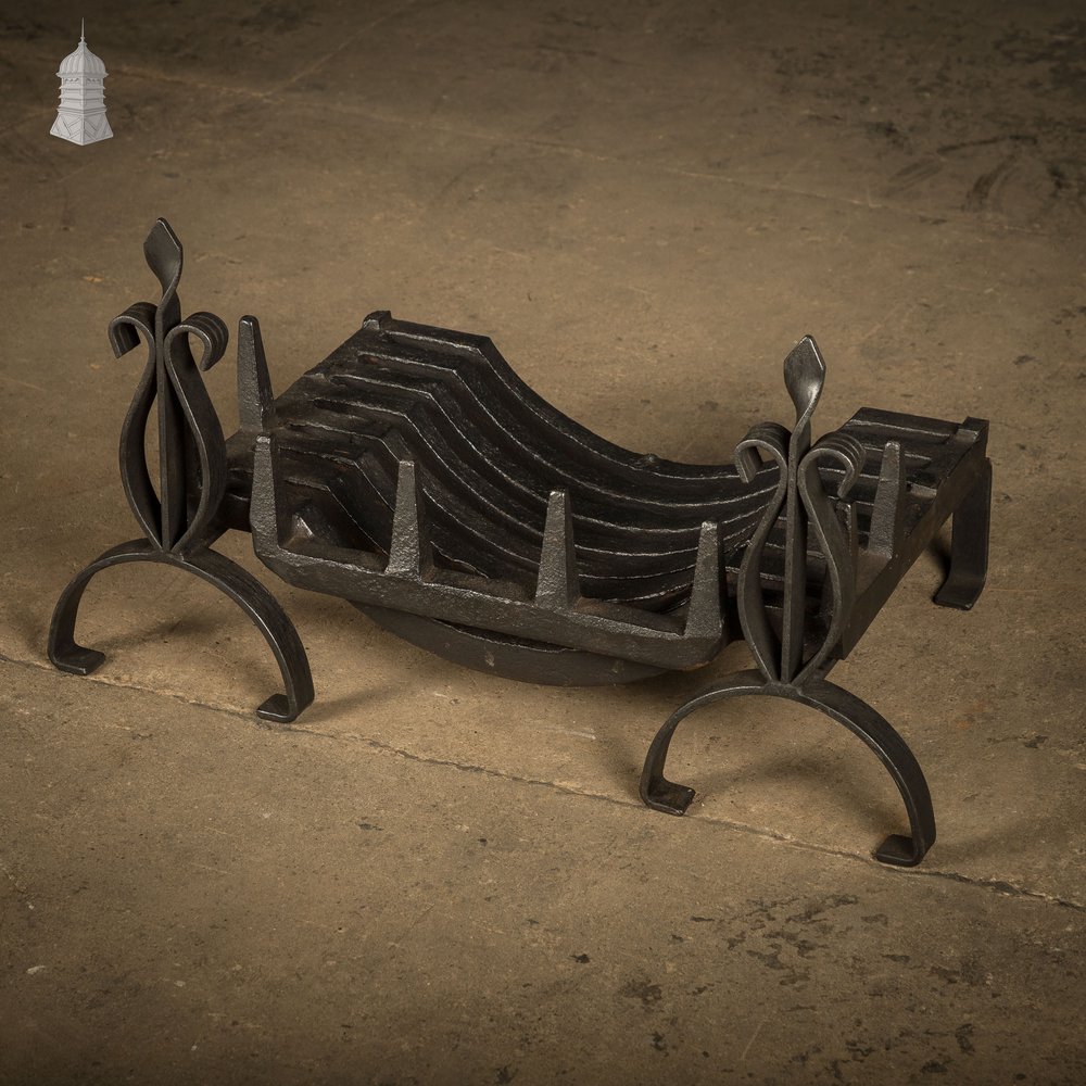A compact cast iron fire grate with andirons. The basket has a gently curved slatted base, and fuel is contained by a row of spikes along three edges. Two spikes on either side appear to have been removed in the past. Please view listing images for more details.