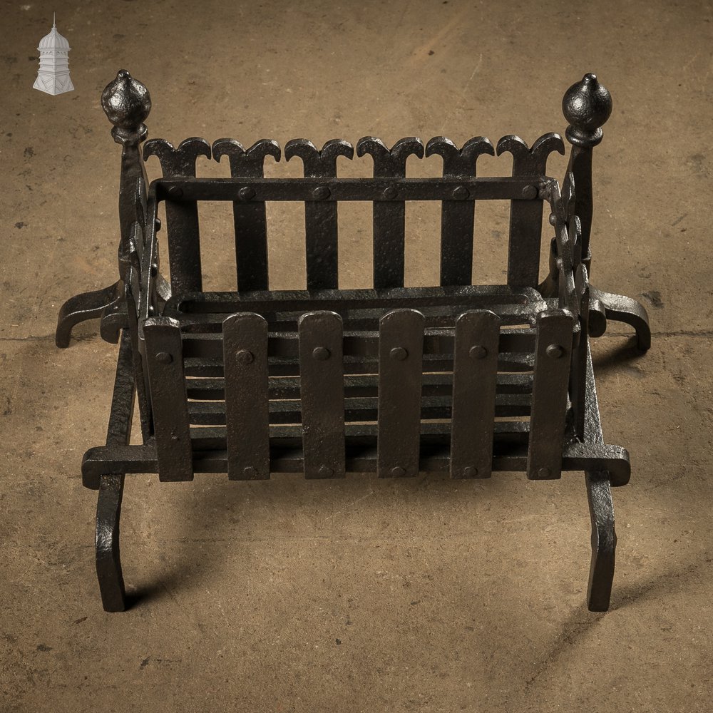 A classic compact cast iron fire basket and andirons, featuring a sturdy, riveted construction and distinctive rams horn design. Perfect for adding warmth and character to any traditional or rustic space.