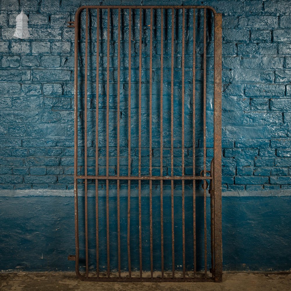 Single metal pedestrian gate with a clean, simple profile and gently rounded corners. The presence of a closing strip and drop bolt suggests it was originally part of a pair, though the gate works well on its own and reads as a complete piece. Well proportioned and utilitarian in character, it suits garden entrances and side passages. Surface rust and some old paint but structurally sound. See listing images to assess condition.