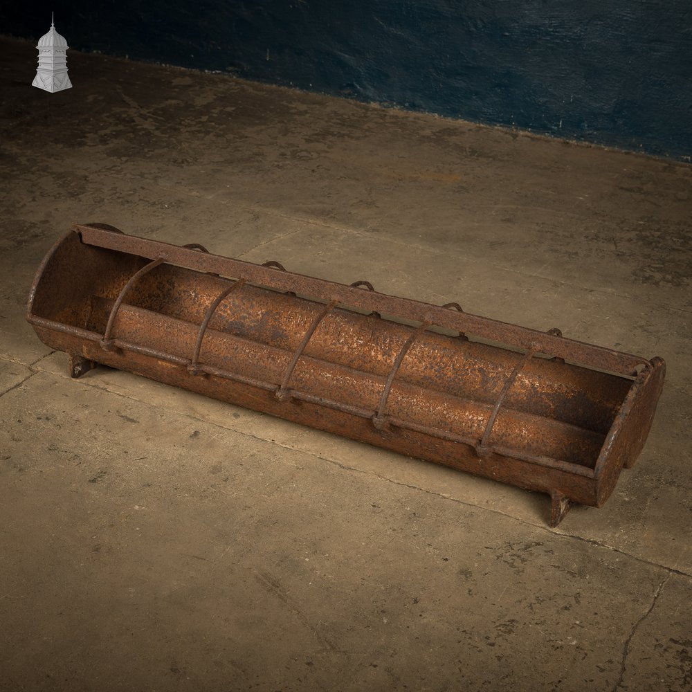 A cast iron feed or water trough with internal divisions and an upper cage that creates separate feeding areas for several pigs or smaller livestock. Extensive surface rust and weathering show its working life. It is water tight, and adding a few drainage holes would make it suitable for planting.