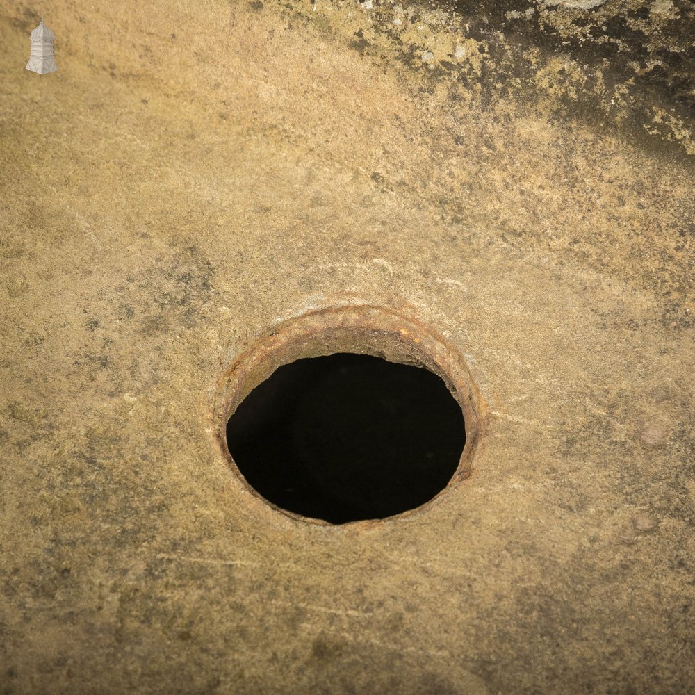 A shallow weathered stone trough sink / planter with a large central drainage hole. Lichen and moss on the exterior enhancing the natural weathered look. Please use the listing photos as a visual reference of the condition.