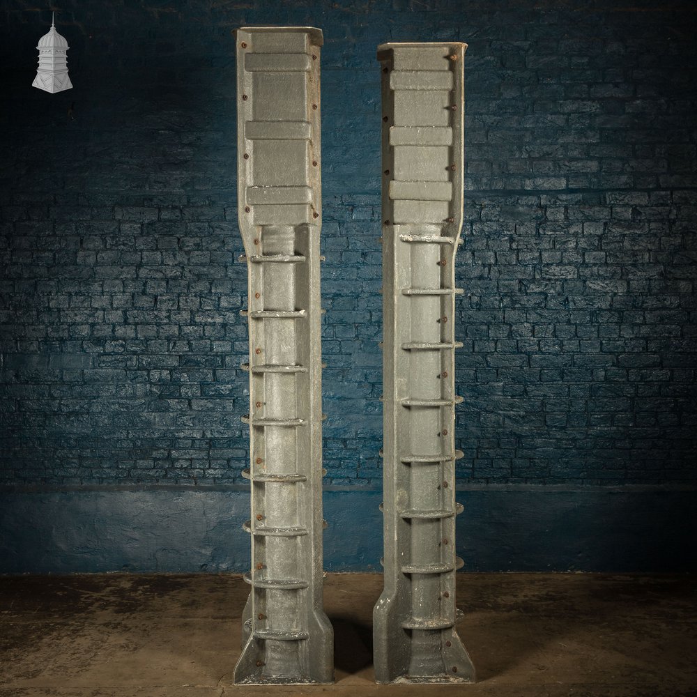 Pair of fibreglass column moulds. Made for casting plaster or concrete columns with a smooth classical form and decorative top and base. The exterior steals the attention. Strong industrial lines with a heavy, almost mechanical presence. The shapes read as sci-fi or steampunk. Ribbing, bolts, and panel-like forms give them real character. They offer plenty of creative potential. Use as sculptural pieces, lighting surrounds, set dressing, or bold garden features. Wear from past use is visible. Check the images for condition. Please note the heights are slightly different, and the Internal Diameter given is measured at the narrowest point of the column.