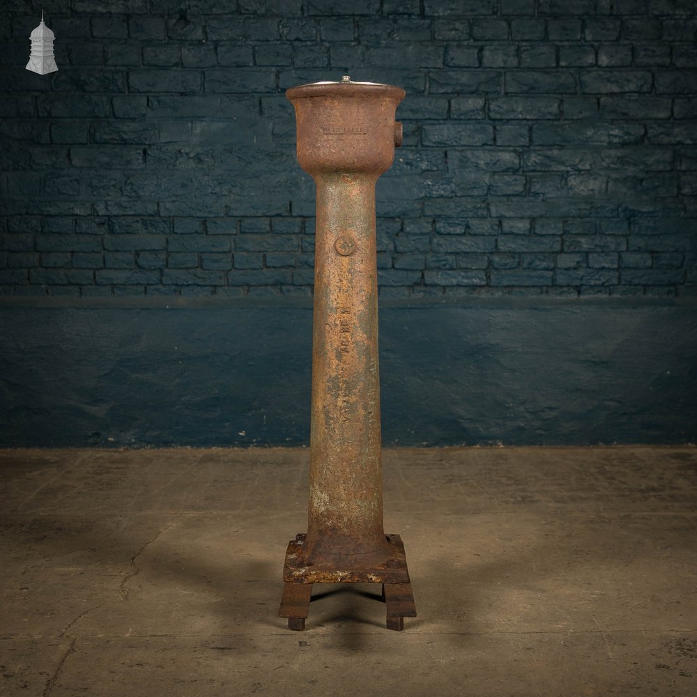 A reclaimed cast iron drinking water fountain. A simple tapered column base with rusted finish with a weathered chrome bowl. A maker's mark around the top reads 'Glenfield'. The four bolts used to anchor to the ground are still present. This item is sold untested and as a decorative item only. Please use the listing photos as a visual reference of the condition.