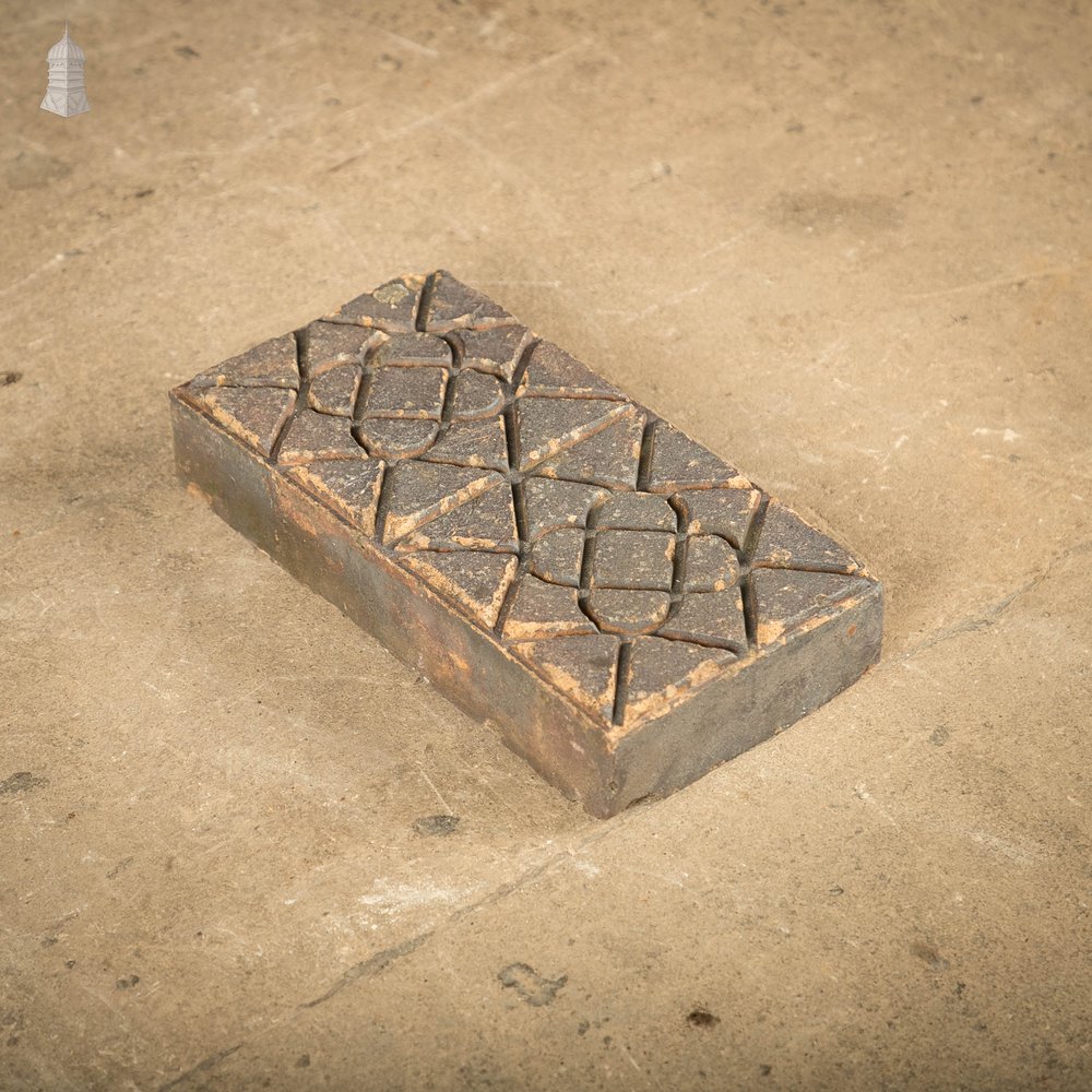 A lovely batch of rare reclaimed patterned Staffordshire blue pavers. A ‘2 block’ brick with an unusual stylized repeating floral pattern and a natural worn finish. This batch is made up of 106 bricks and will cover an area of approximately 5.5 Square Metres.