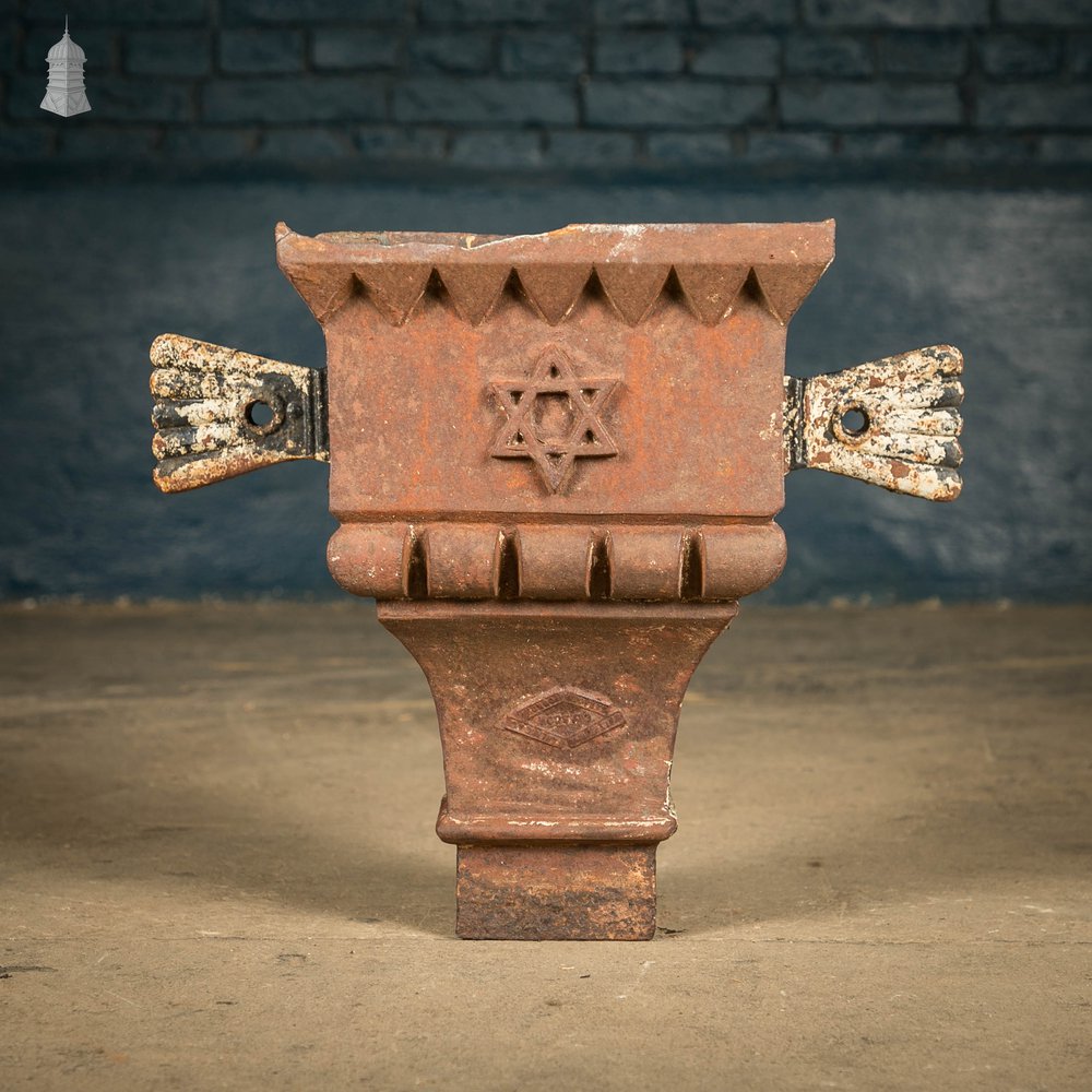 Original quality 19th C cast iron Rainwater Hopper. An unusual example with a Jewish Star of David on the front below a sawtooth pattern. The manufacturer is stamped just above the downpipe connector but is unfortunately too worn to distinguish. To the sides the wing shaped flanges each have a bolt hole for mounting. The top lip has been damaged at some point in the past, but this does not appear to effect the useability of the item either as intended as a rainwater hopper or repurposed into a wall mounted planter or similar.