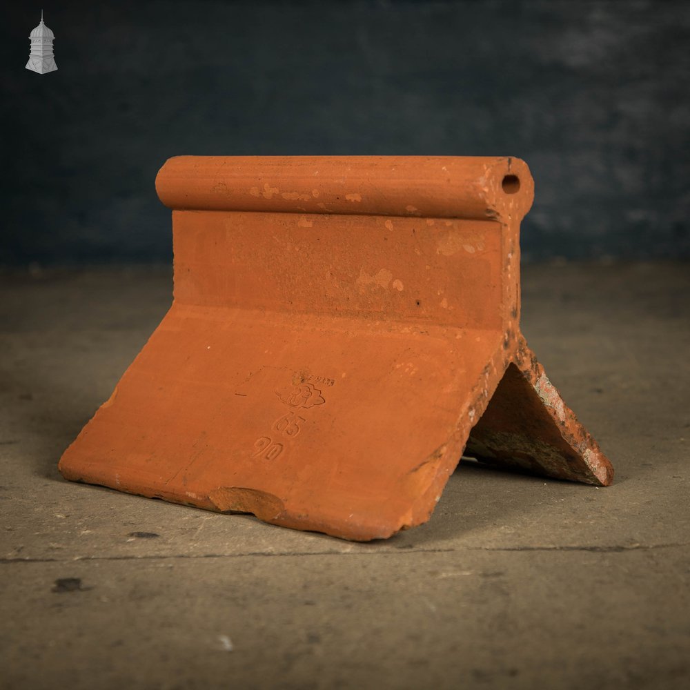 A batch of 10 reclaimed crested roll top ridge tiles, 90° (45° pitch) in red clay, covering a 3-metre run (excluding allowance for mortar joints). Sorted and cleaned, ready to use. Some residual mortar may remain. Ideal for traditional repairs, period properties, or character builds.