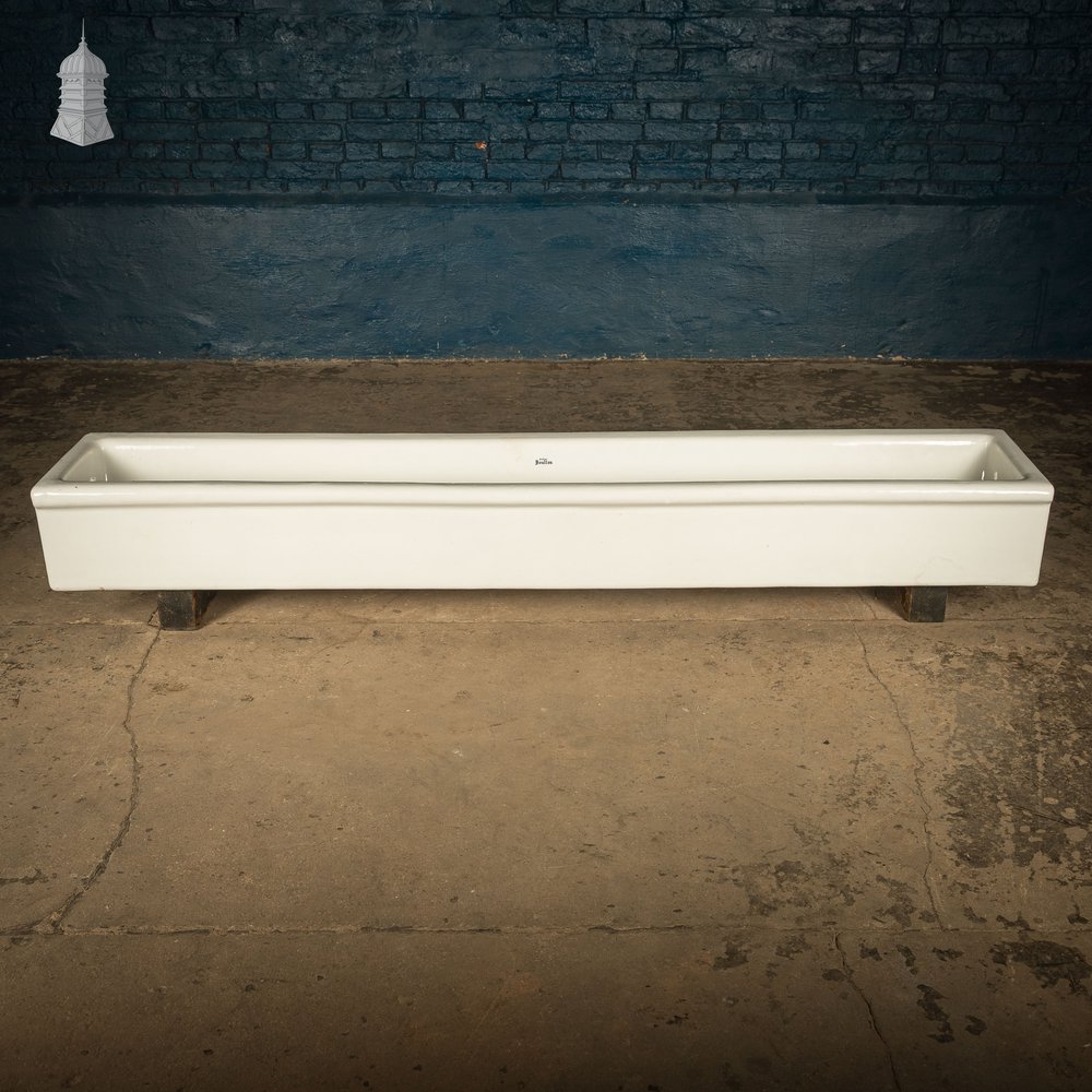 A vintage 6ft long white glazed trough sink by Royal Doulton. Originally used as a communal handwash basin in a school or factory, it allowed multiple people to wash hands at the same time. Taps would have been wall mounted, so there are no holes in the rear edge. Mid-century design with durable glazed ceramic construction, suitable for restoration or reuse in a residential or commercial setting.