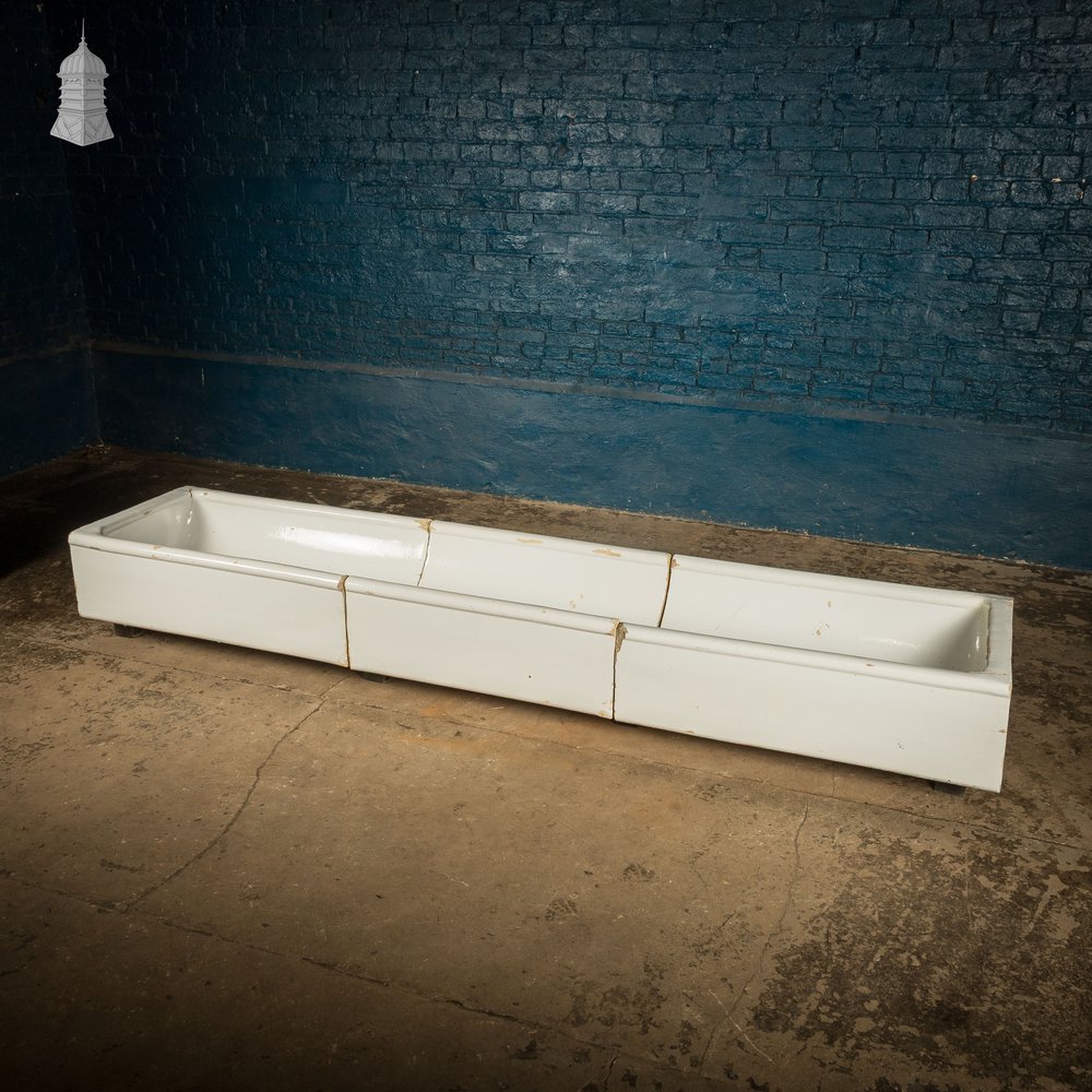 Large sectional white glazed trough sink. Formed from three sections. The glaze shows age, with surface wear and marks from years of use. Lines, chips, and scuffs sit across the surface. Please see the item images to assess condition.