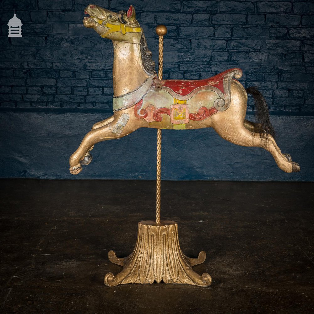 Originally made in the 19th Century carved from timber and hand-painted, this beautiful galloper horse has had sympathetic repairs, with the historic layers of paint up until the 20th century preserved. The model is attributed J.R. Anderson of Bristol and dates to the late 19th Century. The quality of the design and carving is one of the best. It is regarded as in original condition and has not been restored to a "as new" finish, damaged timber areas have been carefully repaired with matching wood and paint types to sympathetically match the historic finishes. The mount has been specially made recently to display the horses, which utilise reclaimed elements.
