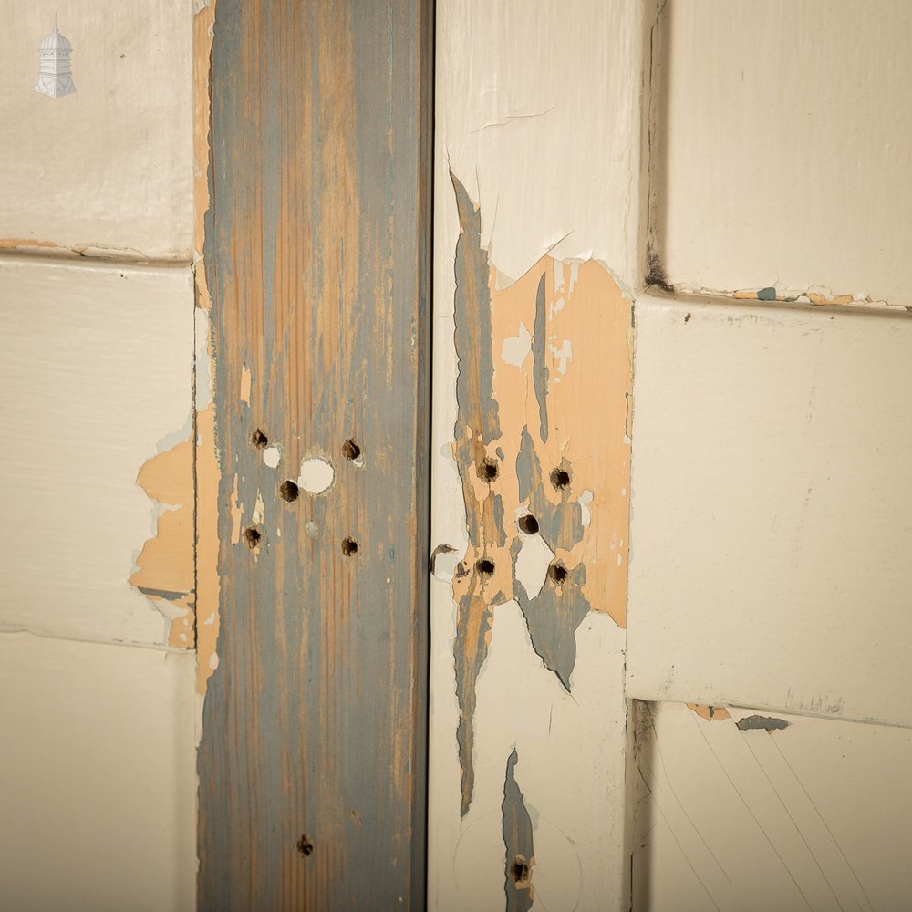 Two pairs of pine reclaimed panelled shutters. White distressed paint finish each shutter has two shaker style panels. Old hinges are present along with multiple holes from old handles and locks. Wear including knocks and scuffs is consistent with age. Please use the listing photos as a visual reference of condition.