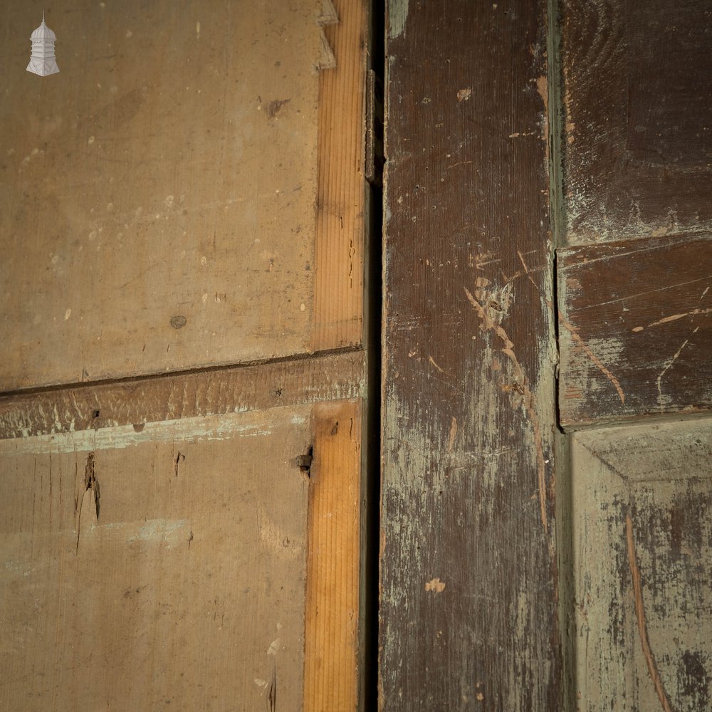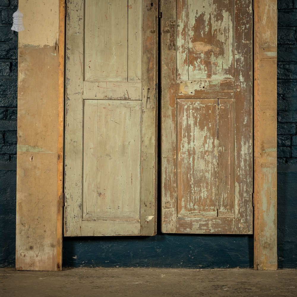 A pair of reclaimed pine three-panel window shutters with a flakey distressed paint finish. Old hinges are present along with some hardware and sections of frame. Wear including knocks and scuffs is consistent with age. Please use the listing photos as a visual reference of the condition.
