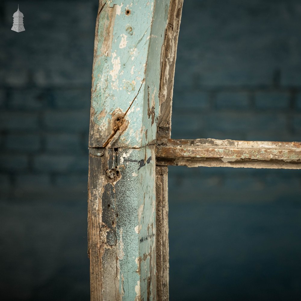 A reclaimed 19th C arch top gothic revival style 5 pane wooden window with ribbed and rippled cathedral textured glass and a distressed paint finish. The two larger pieces of glass and one arched piece is missing. Similar windows are available. Wear including knocks and scuffs are consistent with age. Use the listing photos as a visual reference of the condition. Please note we cannot insure glass in transit. Please see our terms and conditions for more details.